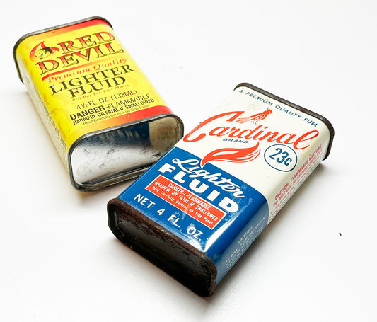 Vintage Empty Metal Red Devil and Cardinal Lighter Fluid Cans