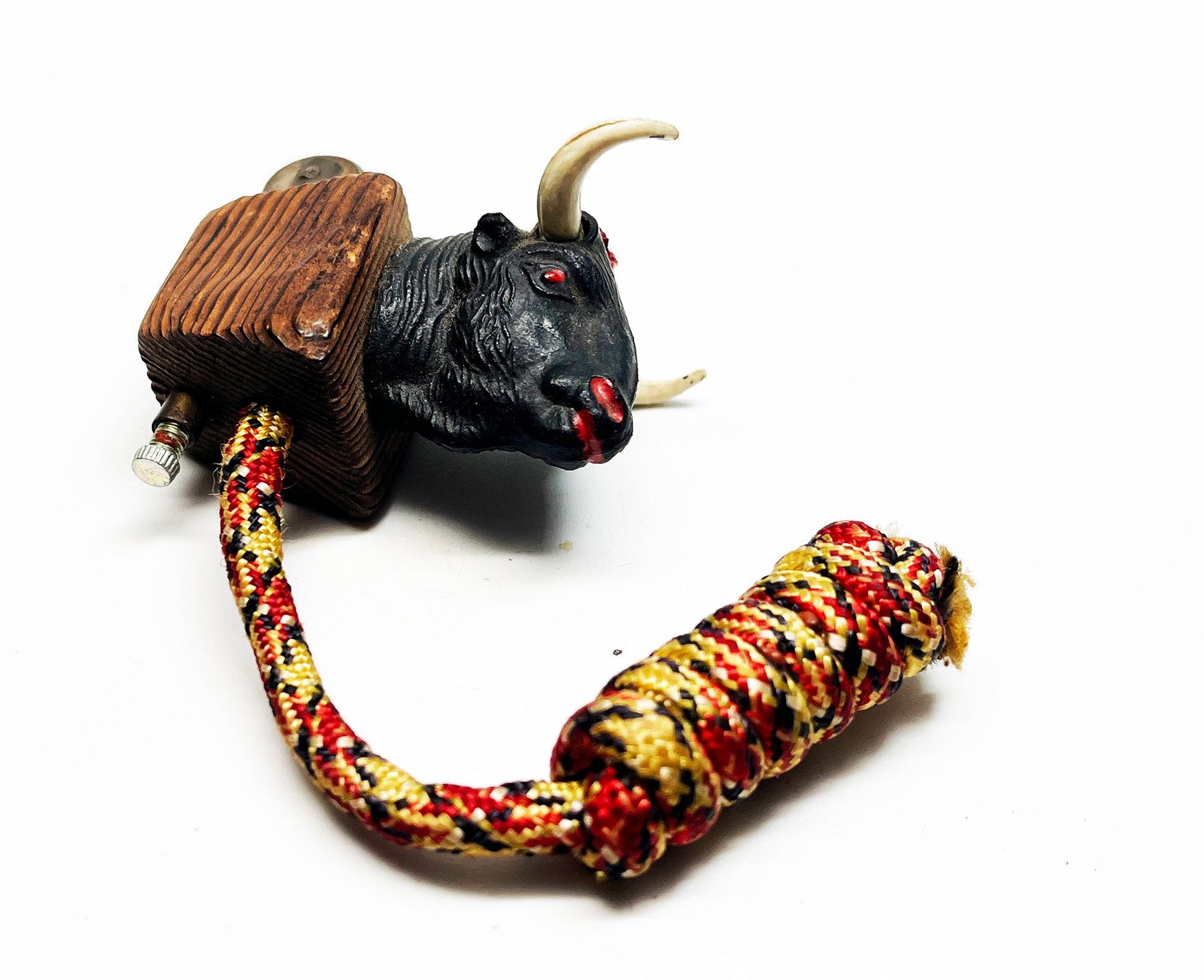Amazing vintage buffalo head rope lighter. This is a weird one, and I don't have much information. I'm dating this around the 1930's. These style lighters aren't really lighters - more like firestarters. The rope is held next to the flint wheel in order to get an ember on the rope, then this is used to start a fire.