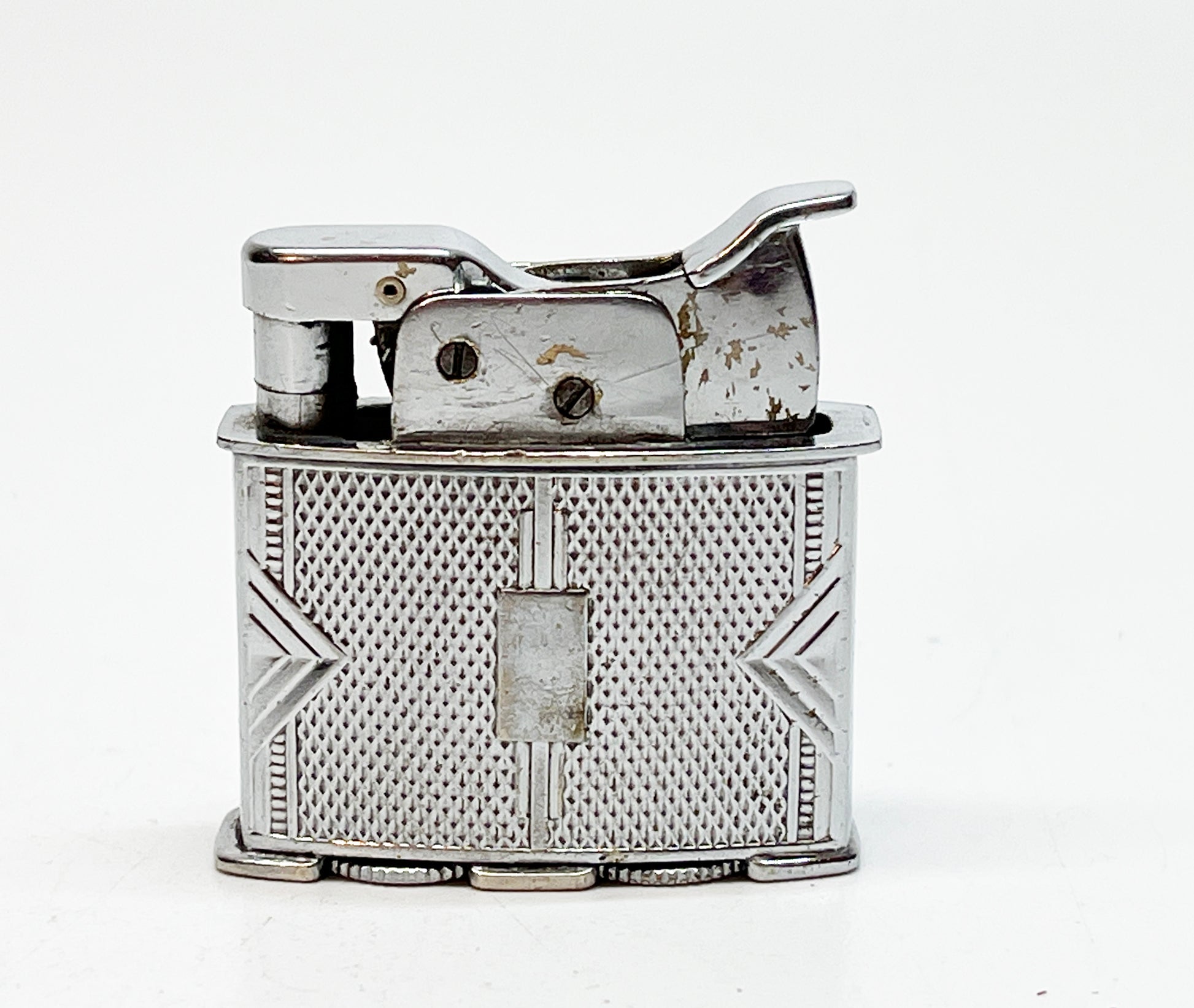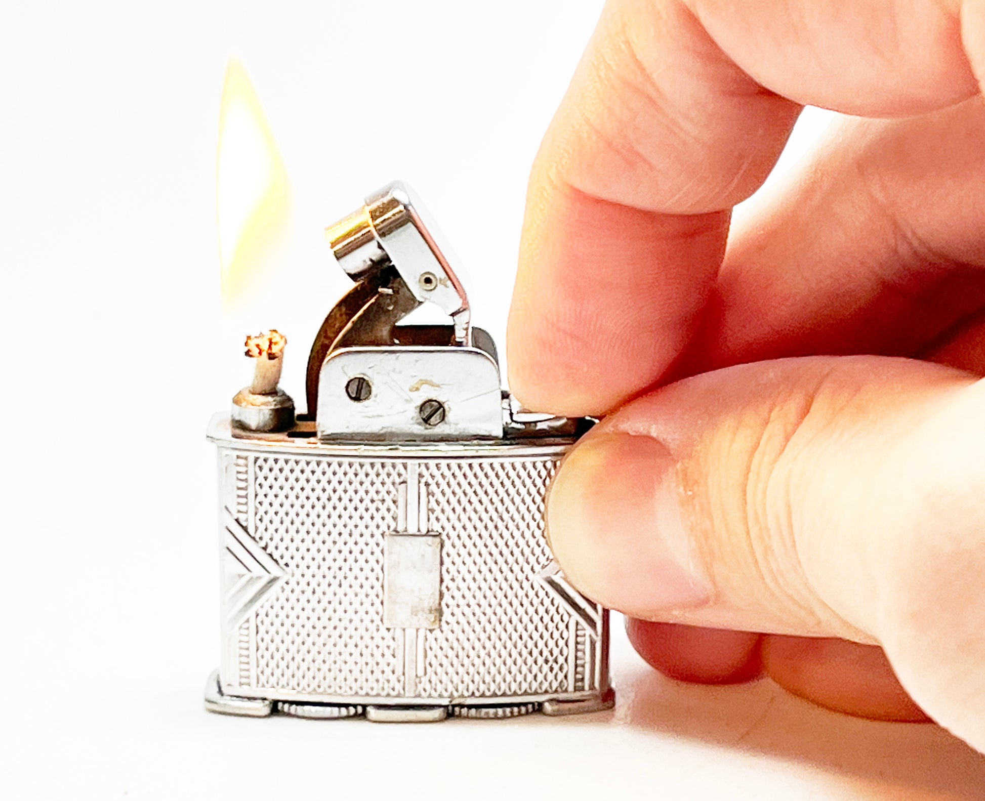 This vintage lighter was disassembled, cleaned, and rebuilt with a new flint/packing, and any needed replacement parts. Wonderful vintage condition. Awesome display piece. 2" inches tall x 1 1/2" wide x 1 1/2" deep.