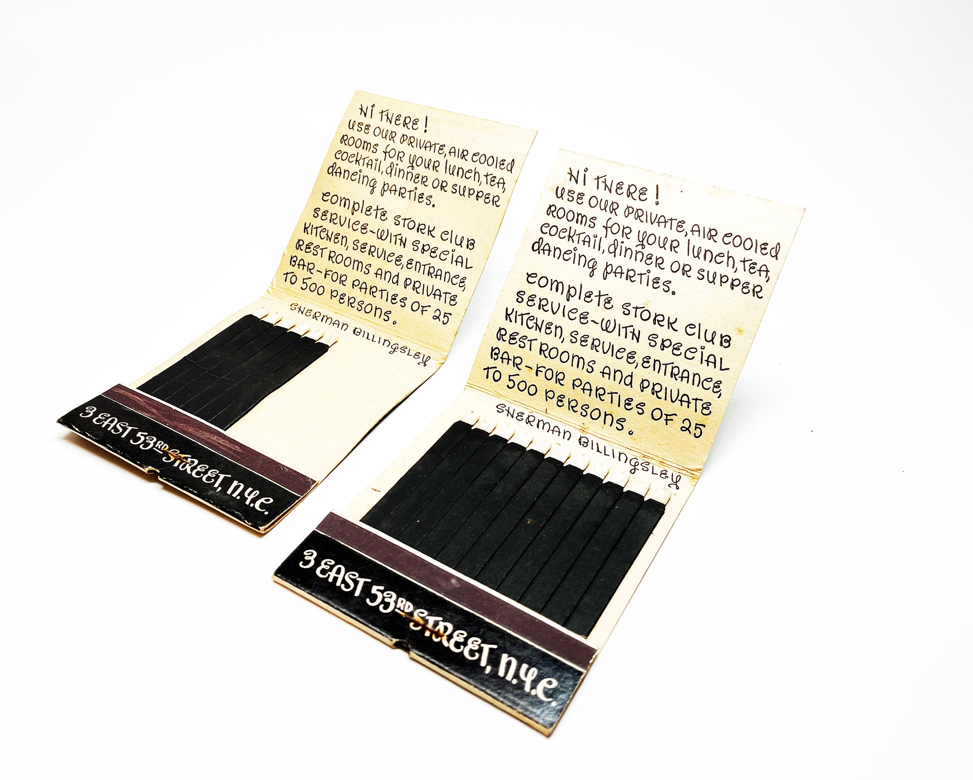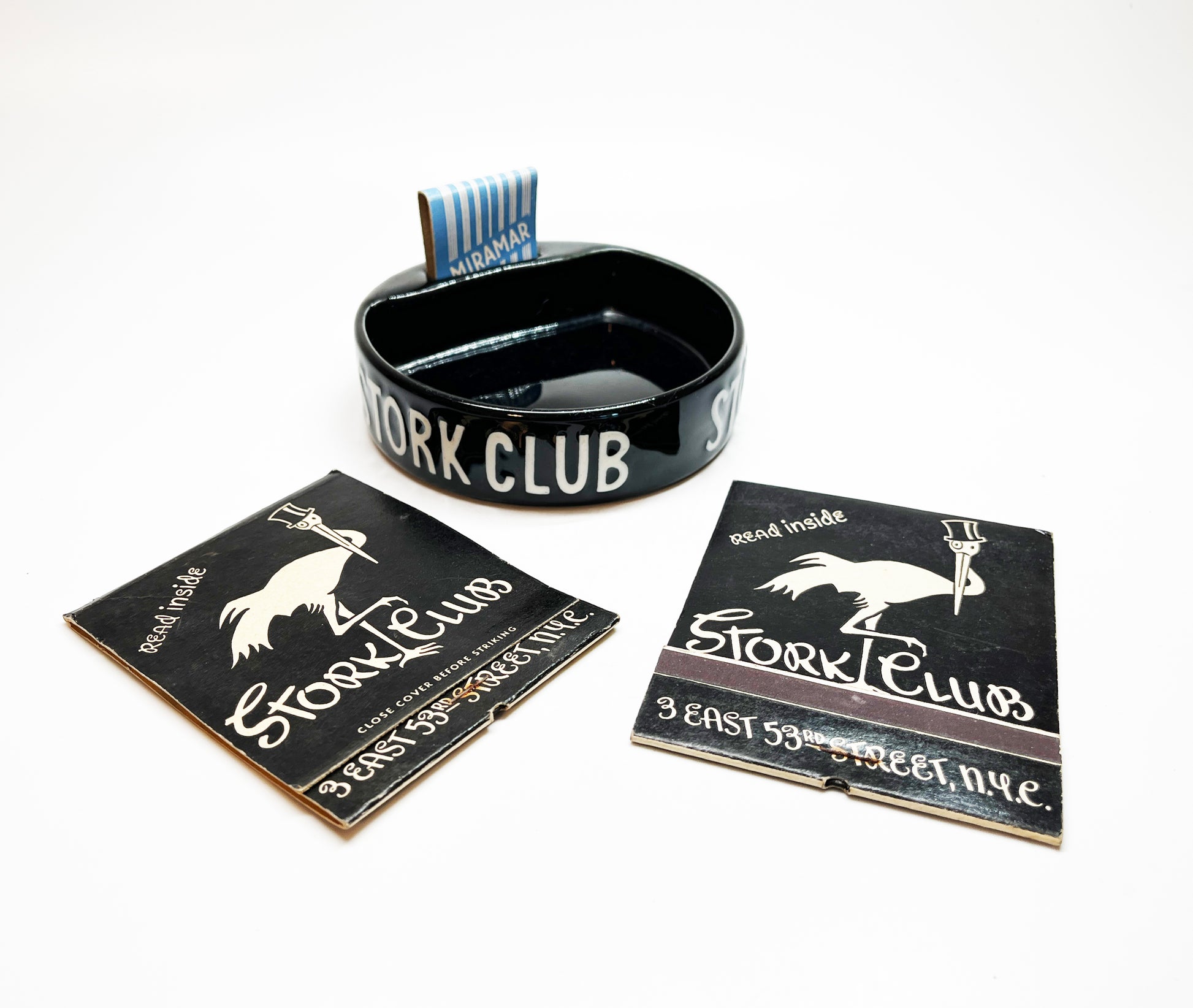 Vintage ashtray from the iconic Stork Club in New York City with an one original complete oversized matchbook and another where some of the matches have been used. Also comes with a normal matchbook for a different NYC club from the same era.
