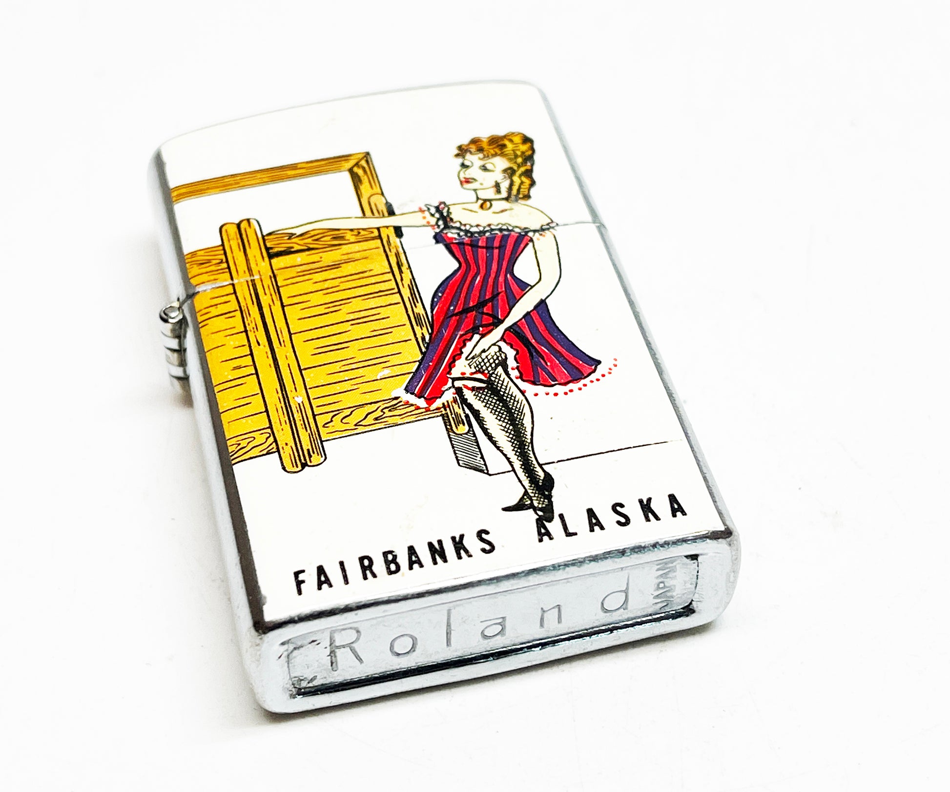 Amazing working 1960's Japanese-made Fairbanks, Alaska souvenir lighter. Great graphics on the front of a girl in front of a saloon. Made by the Roland Company. Excellent condition throughout.