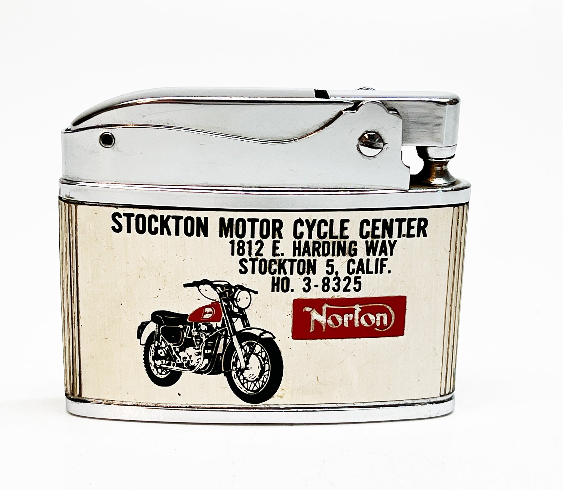 Amazing 1960s Honda / Norton motorcycle dealership advertising lighter from the Stockton Motor Cycle Center in Stockton, California. Stunning graphics on both sides. Rare piece. Working perfectly. A must-have for motorcycle fans.