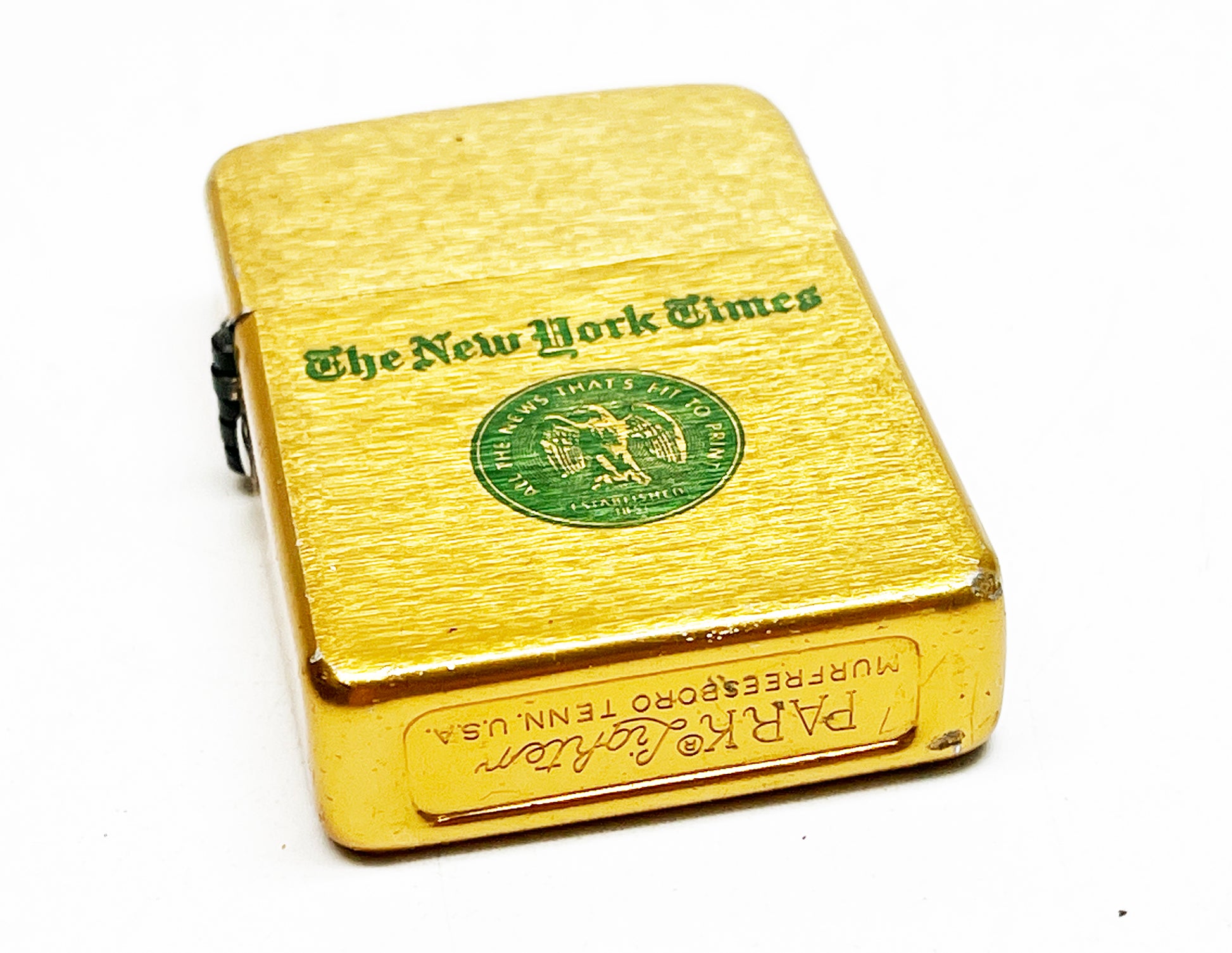 Amazing working aluminum vintage New York Times 1960s Storm King flip-top newspaper lighter. Great green graphics on the front. All the news that's Fit to Print. Made in the United States. A must-have for journalism enthusiasts. Excellent condition.