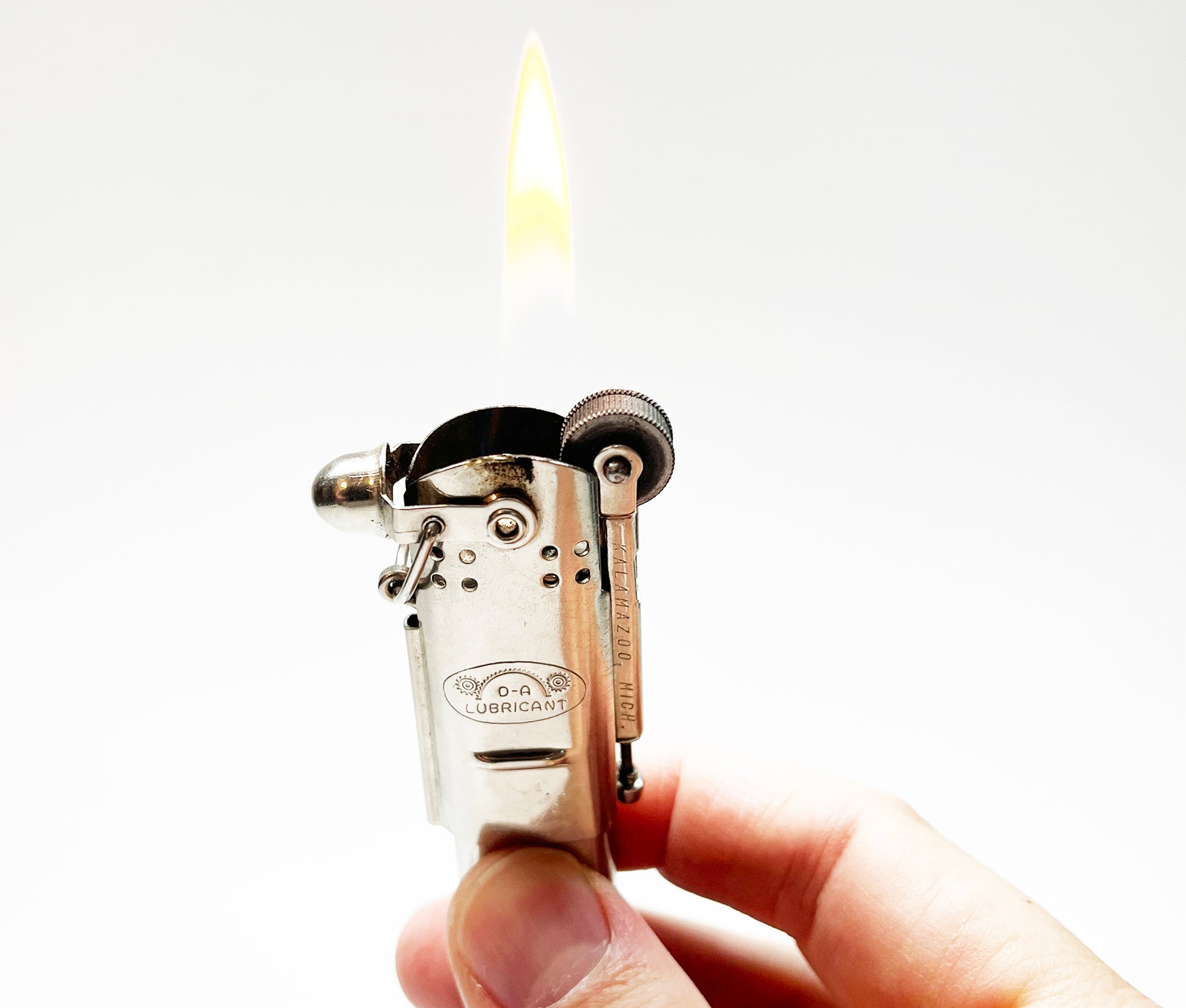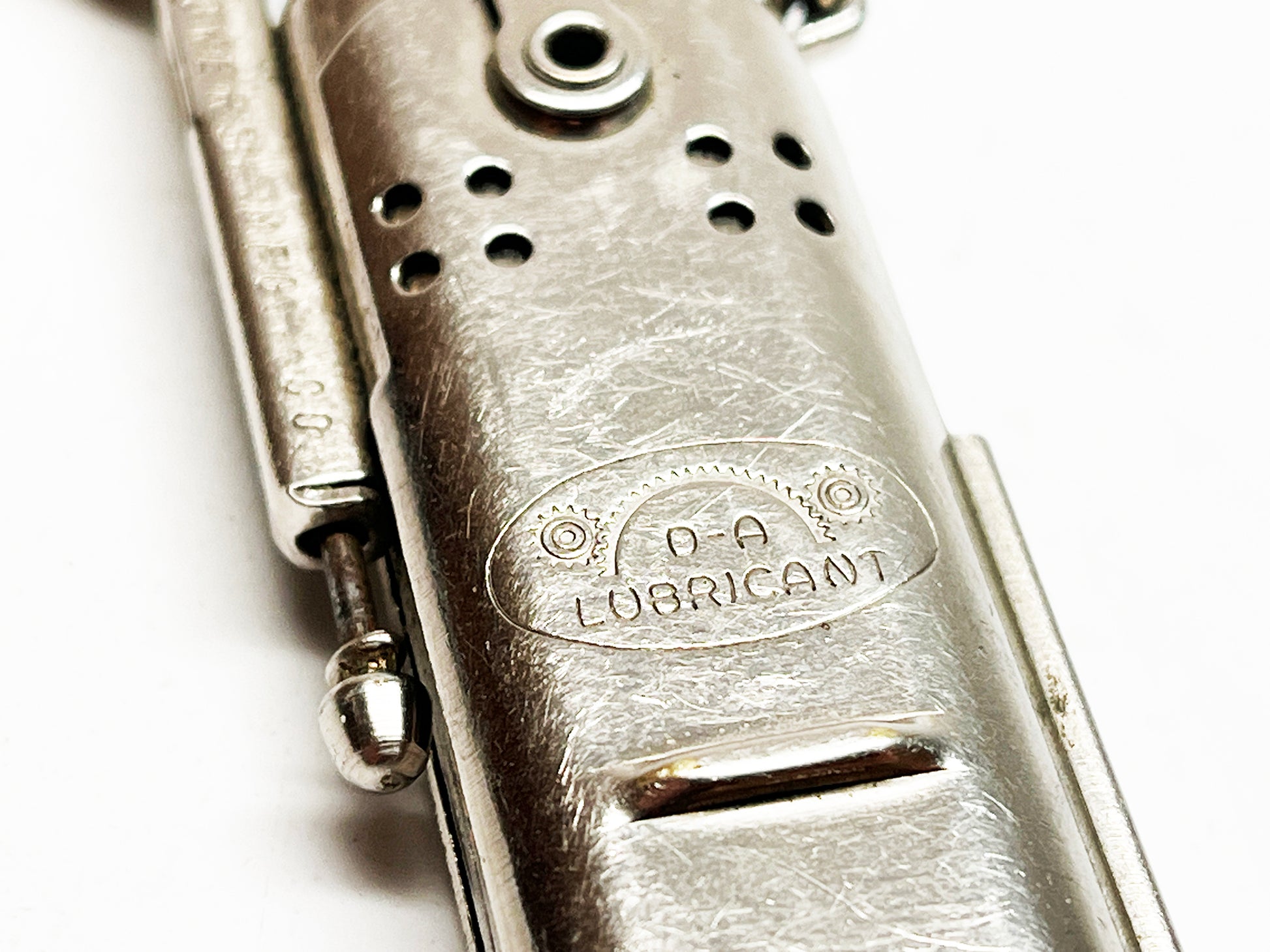 Amazing working vintage Bowers slide sleeve steel trench style lighter. Extremely rare advertising version for DA Lubricants, made in the 1930s in the United States. Perfect working order with new wick and flint. Awesome piece.