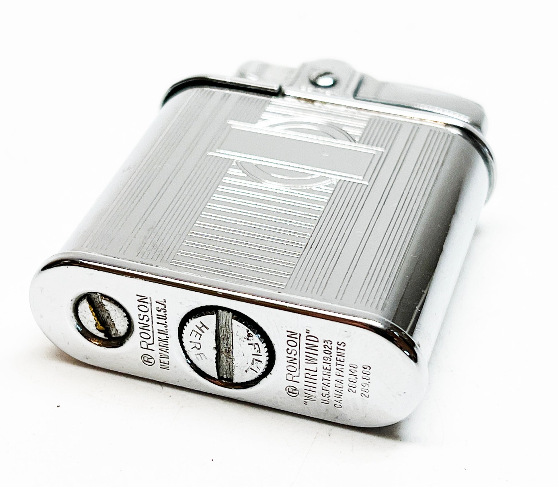 Vintage working Ronson Whirlwind lighter made in the 1950s. This is a great model with an amazing pull up windscreen that can be moved up in order to protect the flame from the wind along with amazing machined patterns throughout and an unengraved initial plate. Great patina.